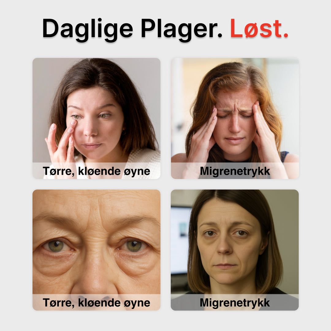 Nordbliss Øyemassasjer bruker termoterapi, luftkompresjon og lavfrekvent vibrasjon for å lindre migrenetrykk og gi lettelse til tørre øyne.